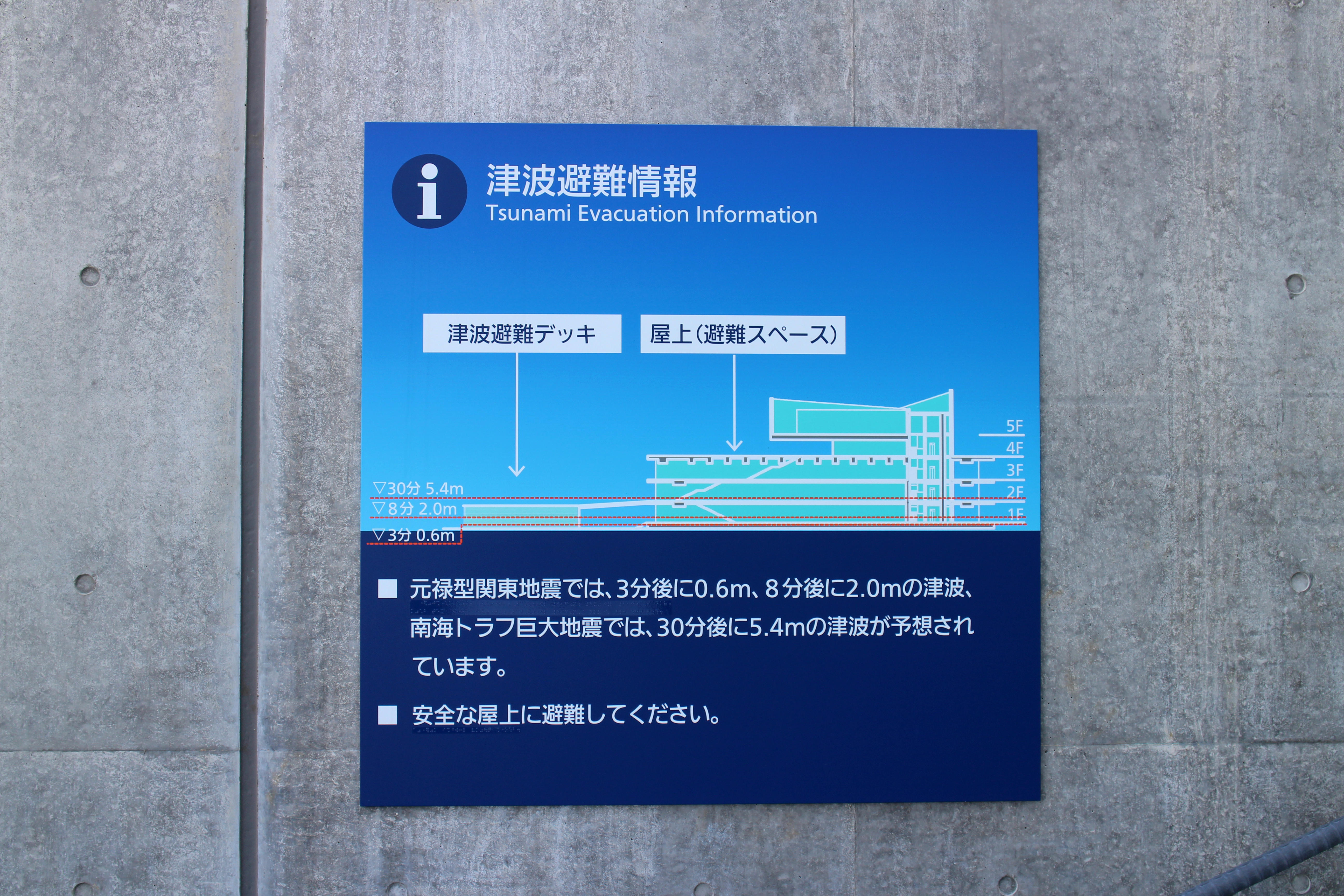 元禄型関東地震(震度6弱)を想定し、船客待合所・津波避難施設の出入り口に接続する津波避難通路(約290メートル)を、高さ4.0メートルで整備したため転落防止が設置されました。