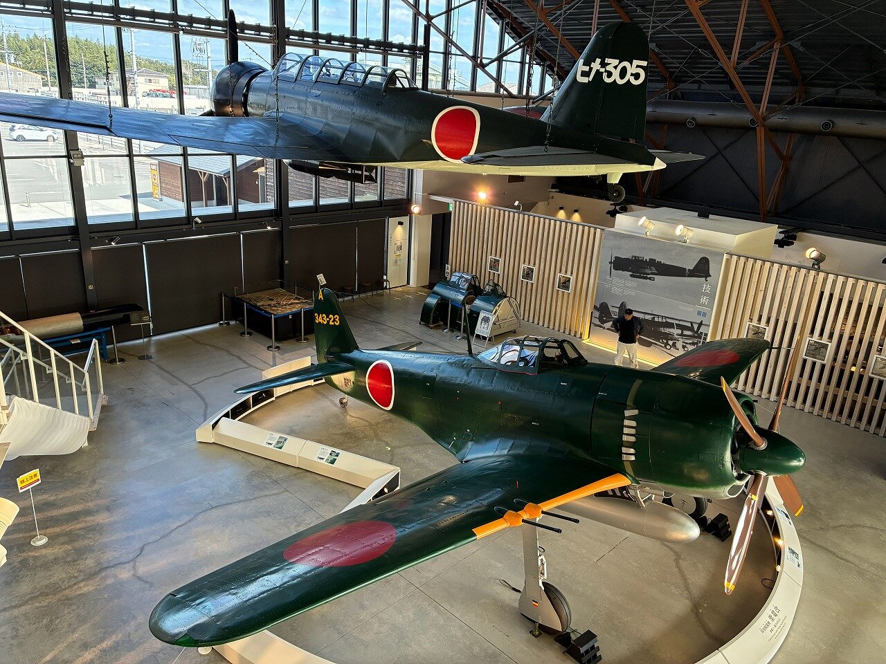 第二次世界大戦末期、滑走路の南西にあった川西航空機姫路製作所鶉野工場で組み立てられていた戦闘機「紫電改」と、パイロット養成に使用され、特攻機としても使われた「九七式艦上攻撃機」の実物大模型を解説とともに展示しています。