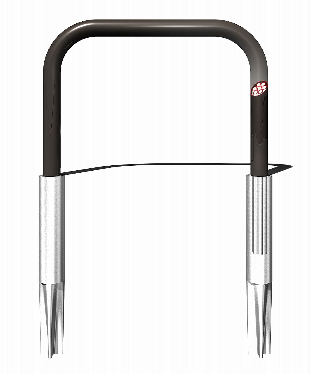 一見、普通の車止めに見えますが、土中式杭基礎+耐衝撃性のハイパーユニットを支柱に内蔵していて、車両衝突時には、内部のスクラムパイプが連続的につぶれるように変形し、衝突エネルギーを吸収して衝撃を受け止めると同時に、車両へのエネルギー伝達をも低減し、乗員への衝撃も柔らげます。支柱径76.3㎜でありながら、車両重量約1.16トン/時速43kmの衝撃に耐えうる性能を有しています。衝撃度に換算すると82.1kJとなります。
