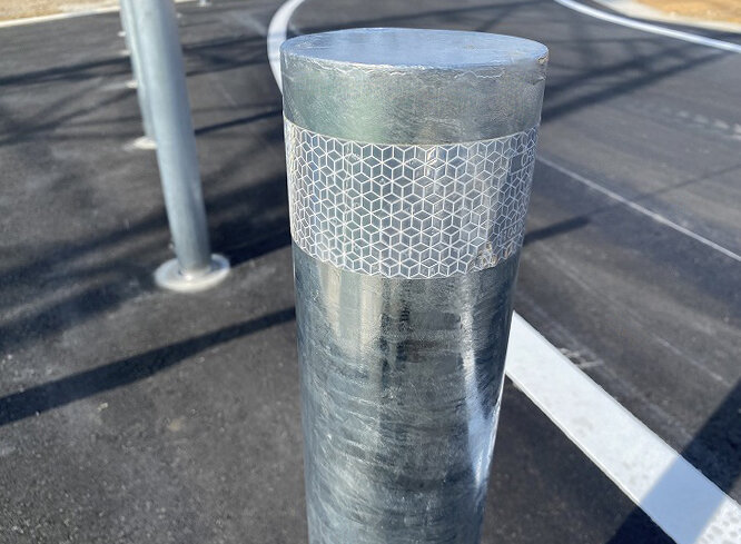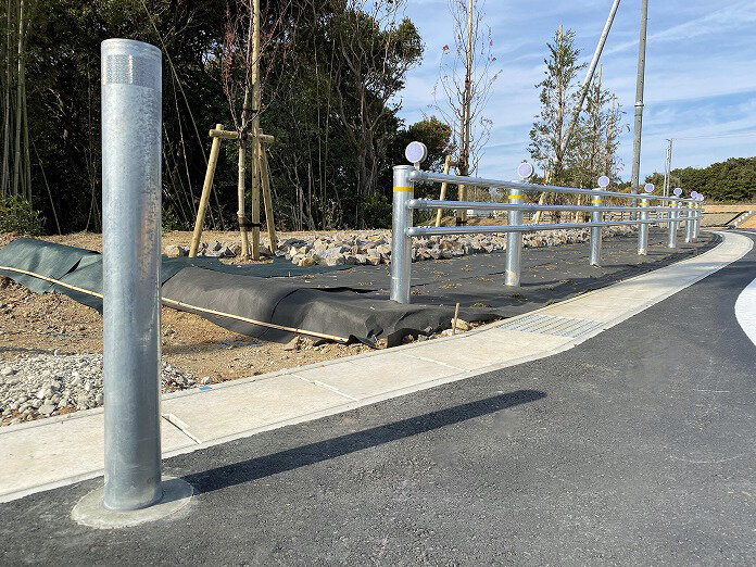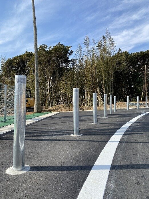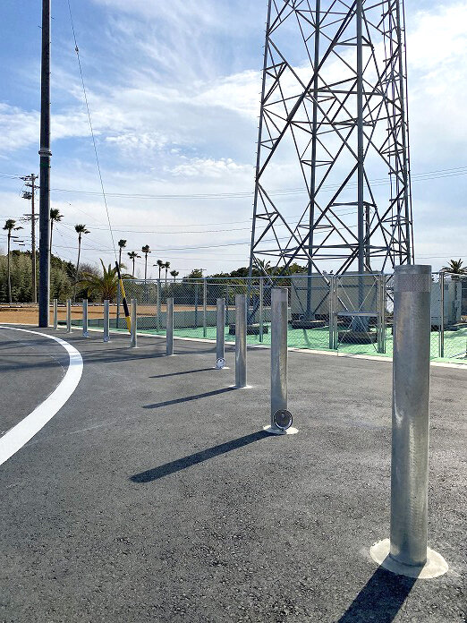 そんなサーフタウン構想の住宅地に溶融亜鉛メッキ仕上の耐衝撃性車止めハイパーボラードをご採用いただきました。固定式と脱着式を交互に施工しています。内部はご覧のようなスクラムパイプ構造を採用しています。また、スリーブパイルを施工した土中式ですので施工性および安全性も抜群で、NETISにおいて最高ランクのVE評価を獲得しています。